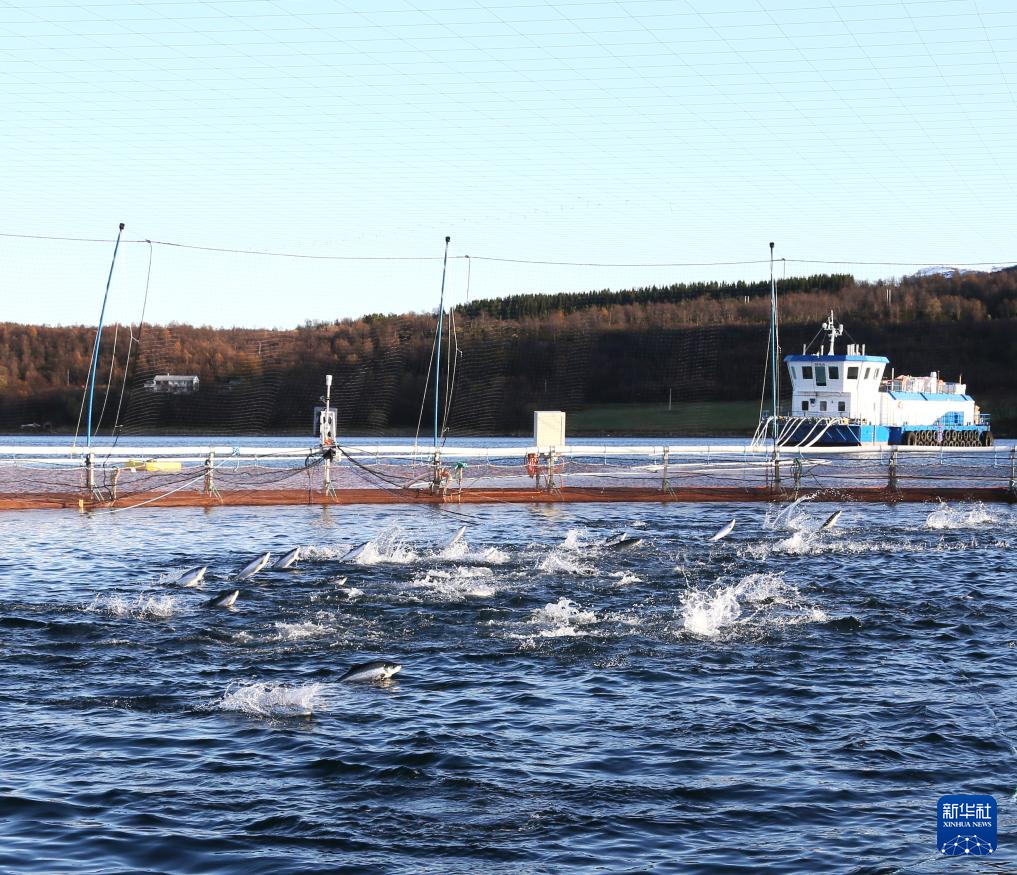 這張2023年10月10日拍攝的資料照片顯示的是位于挪威北部特羅姆斯郡峽灣中的三文魚養殖網箱。新華社記者 張玉亮 攝