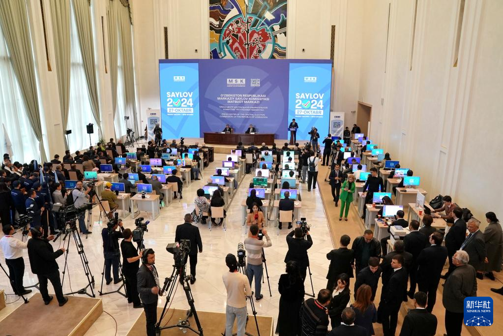 10月28日,烏茲別克斯坦中央選舉委員會在首都塔什干舉行新聞發布會宣布烏最高會議立法院(議會下院)選舉初步結果。新華社發(扎法爾攝)