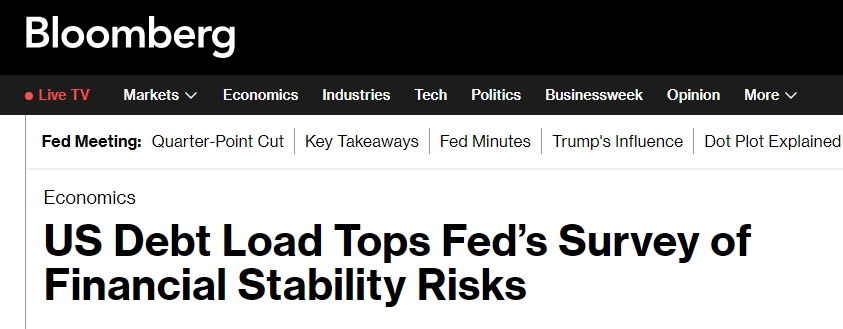 彭博社(Bloomberg)在報(bào)道中提到,美國政府的債務(wù)負(fù)擔(dān)現(xiàn)在被認(rèn)為是金融穩(wěn)定面臨的最大風(fēng)險(xiǎn),在美聯(lián)儲(chǔ)的一項(xiàng)調(diào)查中,其重要性超過了持續(xù)的通貨膨脹。逾半數(shù)受訪者(54%)認(rèn)為美國財(cái)政債務(wù)的可持續(xù)性是一個(gè)突出風(fēng)險(xiǎn),而半年前這一比例僅為40%。美聯(lián)儲(chǔ)的半年度金融穩(wěn)定報(bào)告寫道:“美國財(cái)政債務(wù)可持續(xù)性方面的擔(dān)憂位居榜首,其次是中東緊張局勢(shì)升級(jí)和政策的不確定性。”