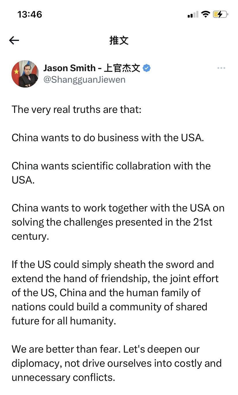 他在推特中稱,“真正的事實是,中國愿意與美國做買賣、進行科學合作,并共同解決21世紀面臨的挑戰。如果美國能夠停止敵對行動,并伸出友誼之手,中美兩國和全人類大家庭可以共同努力構建人類命運共同體。我們比恐懼更強大,讓我們深化外交關系,避免陷入代價高昂且不必要的沖突中。”