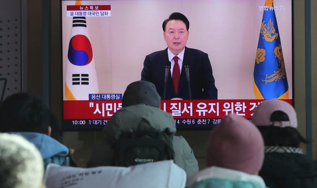 12月12日,在韓國首爾火車站,韓國民眾觀看總統尹錫悅對國民談話的電視直播。新華社記者 姚琪琳 攝