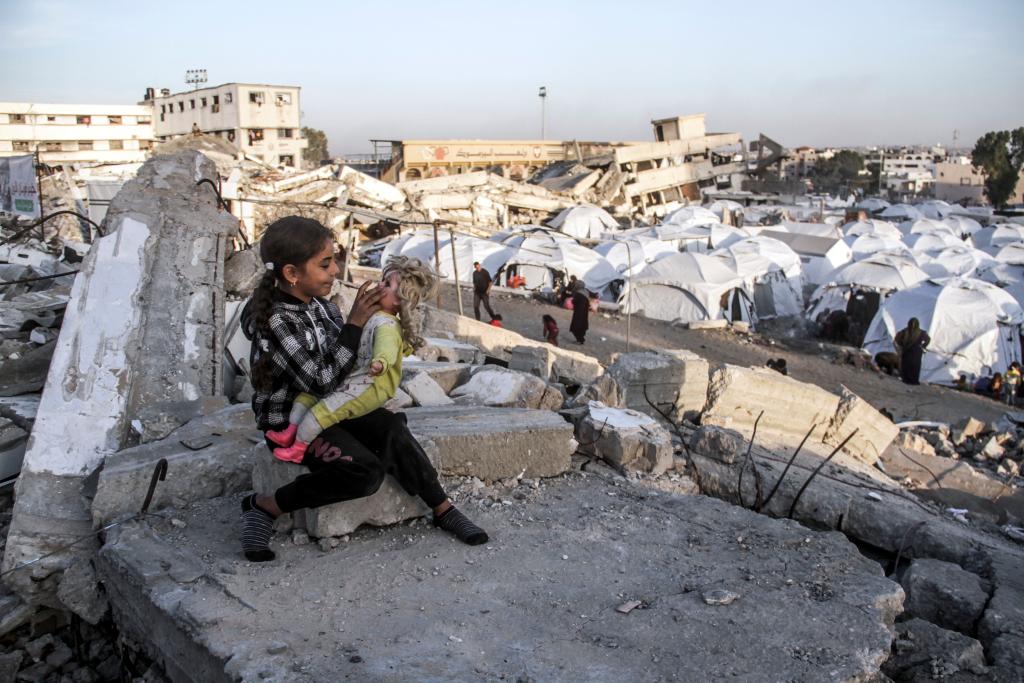 12月9日,在加沙地帶加沙城,一名流離失所的女孩在一處臨時帳篷區玩玩具。新華社發(馬哈茂德·扎基攝)