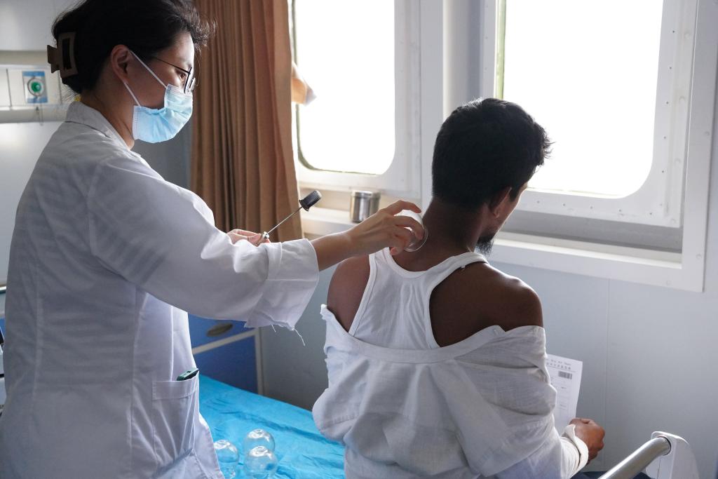 2024年12月24日,在斯里蘭卡科倫坡港,中國海軍“和平方舟”號醫院船上的醫生為19歲的小伙穆賈希德拔火罐。(新華社記者伍岳攝)