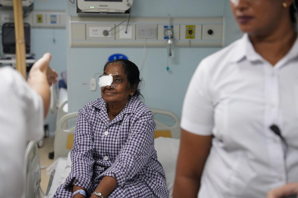 這是2024年12月24日在斯里蘭卡科倫坡港停靠的中國海軍“和平方舟”號醫院船上拍攝的剛進行完白內障手術的本地患者。(新華社記者伍岳攝)