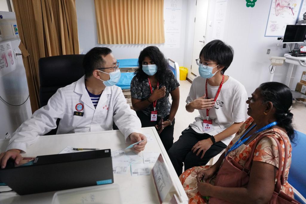 2024年12月24日,在斯里蘭卡科倫坡港,中國海軍“和平方舟”號醫院船上的醫生在志愿者的幫助下對當地患者進行問診。(新華社記者伍岳攝)
