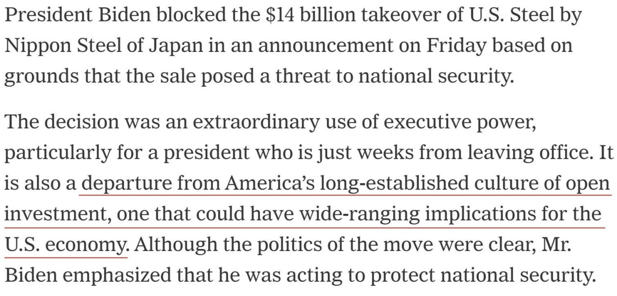 如今,日鐵收購美鋼受阻再次證明,美國政府濫用國家權力干預企業經營的“非市場行為”正在不斷增加。