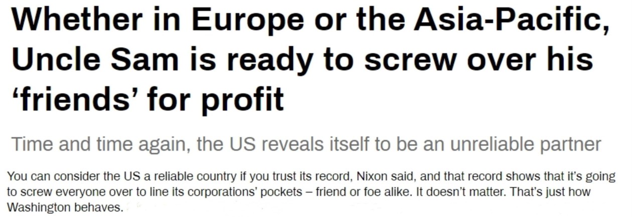 正如美國電臺主持人、政治分析家加蘭·尼克松在一篇文章中所說,歷史記錄表明,“美國為了本國公司的利益會坑害所有人——無論朋友還是敵人。這就是華盛頓的行為方式”。
