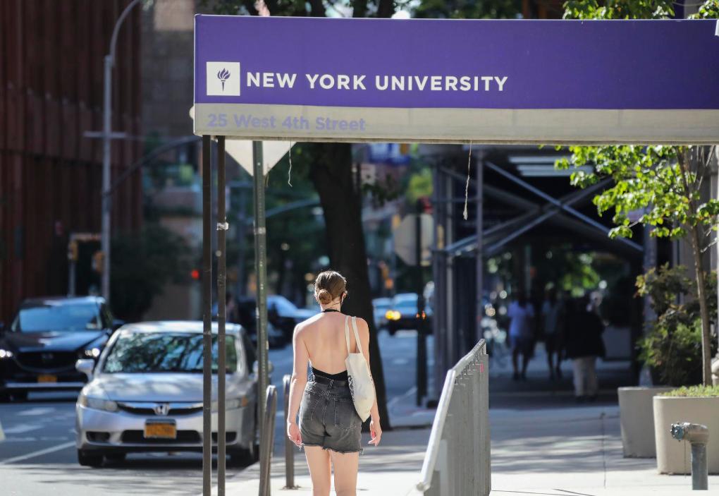 2020年7月14日,一名女子從美國紐約大學的教學樓前走過。新華社記者王迎攝