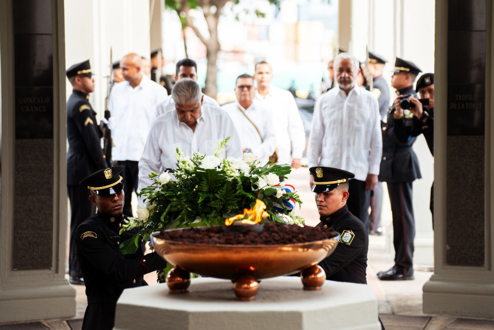 1月9日,在巴拿馬首都巴拿馬城,巴拿馬總統穆利諾(前中)向紀念1964年“護旗運動”的“永恒之火”紀念碑獻花圈。新華社記者許詠政攝