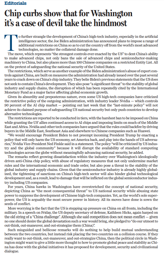 1月13日,拜登政府在卸任前夕出臺人工智能相關出口管制措施,進一步加嚴對人工智能芯片、模型參數等出口管制,還拓展了長臂管轄,對第三方與中國開展正常貿易設置障礙、橫加干涉。拜登政府的這一舉措完全無視后果,旨在進一步遏制中國高科技產業,尤其是人工智能領域的發展。