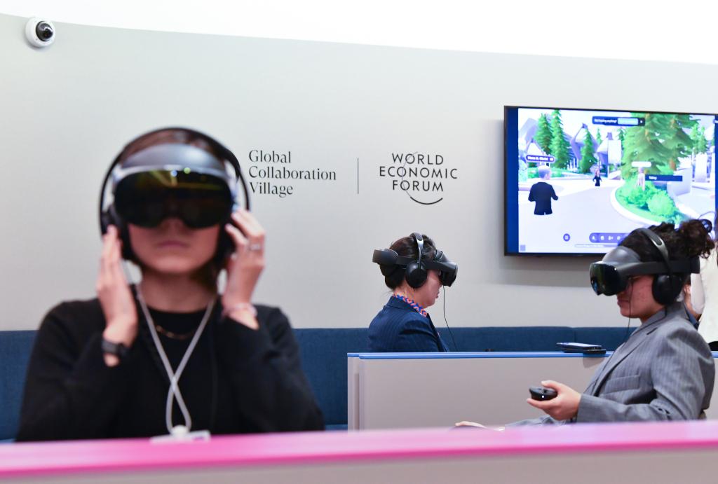 1月23日,在瑞士達沃斯,與會者借助VR設備沉浸式參加世界經濟論壇2025年年會。新華社記者連漪攝