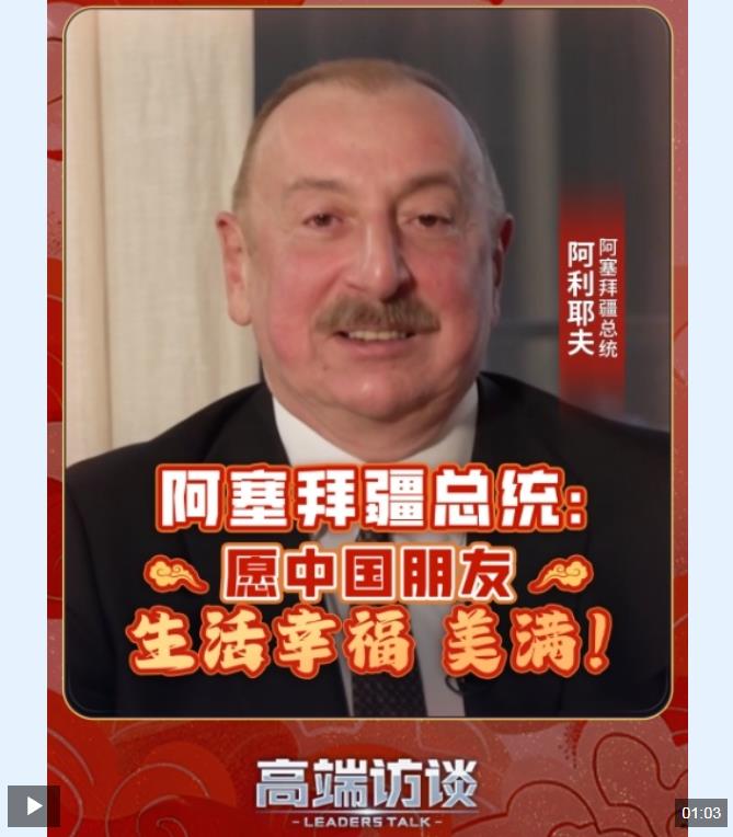 近日,阿塞拜疆總統(tǒng)阿利耶夫送上蛇年新春祝福,祝中國人民新春快樂。阿利耶夫說:“祝愿所有朋友生活美滿,內心平靜 ,擁有穩(wěn)穩(wěn)的幸福?!贝烈曨l,看阿利耶夫還說了什么↑