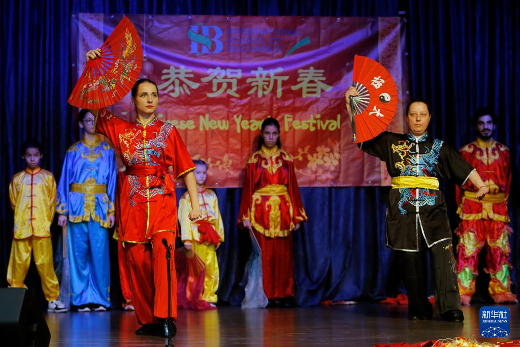 1月31日,在羅馬尼亞布加勒斯特國際學校,羅馬尼亞武術愛好者在新春聯歡會上表演。新華社發(克里斯泰爾攝)