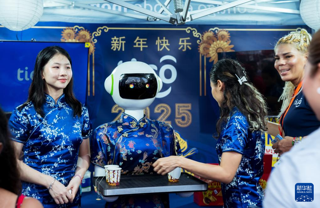 1月31日,在巴拿馬首都巴拿馬城的華僑華人歡樂春節廟會上,機器人為游客送上中國茶水。新華社記者 許詠政 攝