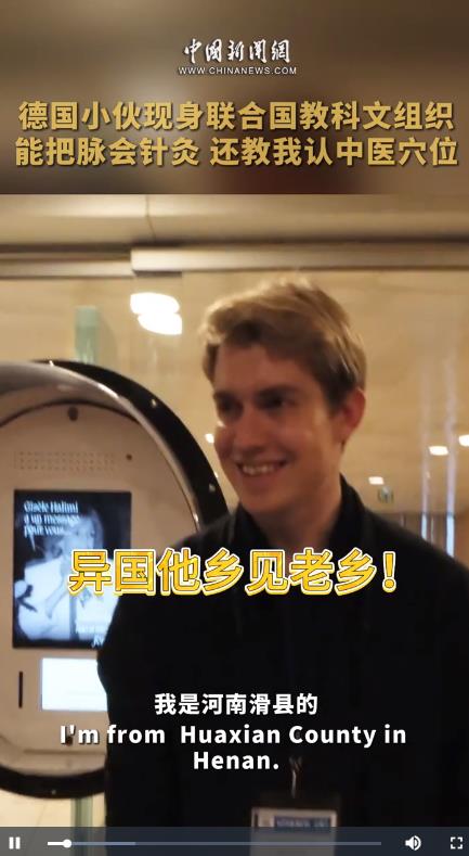 由中國常駐聯(lián)合國教科文組織代表團與河南衛(wèi)視共同舉辦的“我們的春節(jié)”慶祝活動當?shù)貢r間6日晚在位于法國巴黎的聯(lián)合國教科文組織總部華美亮相。活動現(xiàn)場,記者遇到德國小伙推介中醫(yī)文化。這位名叫“無名”的德國小伙,早已憑借地道的河南話和對中醫(yī)的熱愛多次爆火出圈。在法國巴黎聯(lián)合國教科文組織總部,參與“我們的春節(jié)”活動之余,無名還開啟了中醫(yī)小課堂。(王高飛)