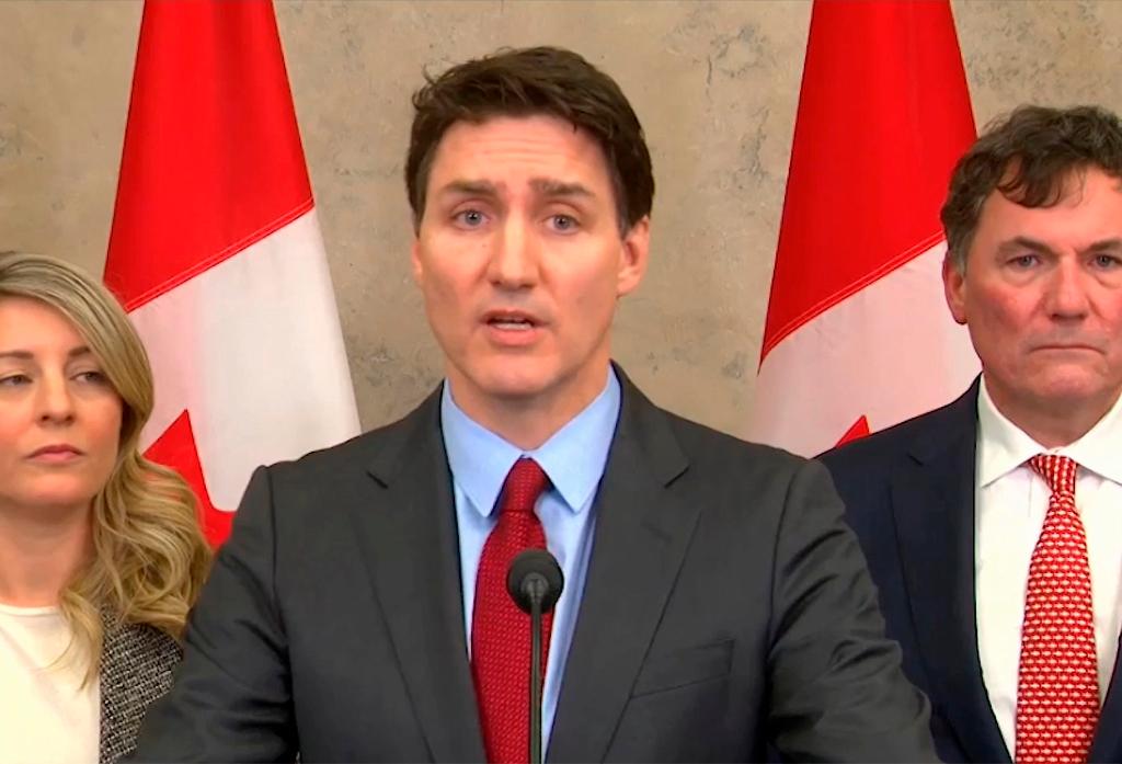 2025年2月1日,加拿大總理特魯多(中)在渥太華接受媒體采訪(視頻截圖)。新華社發