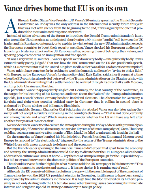 就在萬斯的慕尼黑之行“翻車”之際,法國總統馬克龍在接受《金融時報》采訪時呼吁歐洲加快行動,以新的國防和經濟政策應對特朗普政府回歸白宮所帶來的“電擊式沖擊”。但馬克龍可能沒想到,特朗普政府不僅在經濟和安全問題上向歐洲施壓,還試圖對歐洲國家如何處理國內文化戰爭問題指手畫腳。萬斯的演講表明,美國政府甚至有意介入歐洲國家的內政。正如馬克龍所言:“歐洲已經別無選擇,歐洲已經快無路可走了。”