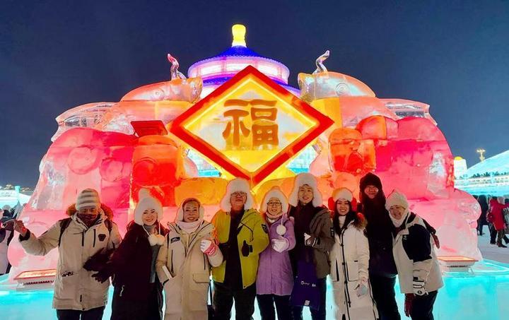 2月1日,馬來西亞游客陳新全(右四)在黑龍江省哈爾濱冰雪大世界游玩時與旅行團友合影(受訪者提供)。