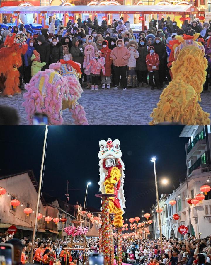 拼版照片:上圖為市民在沈陽新春皇寺廟會上觀看舞獅表演(2023年1月23日新華社記者楊青攝)。下圖為人們在馬來西亞檳城廟會上觀看舞獅表演(2025年2月1日新華社發李奕慧攝)。