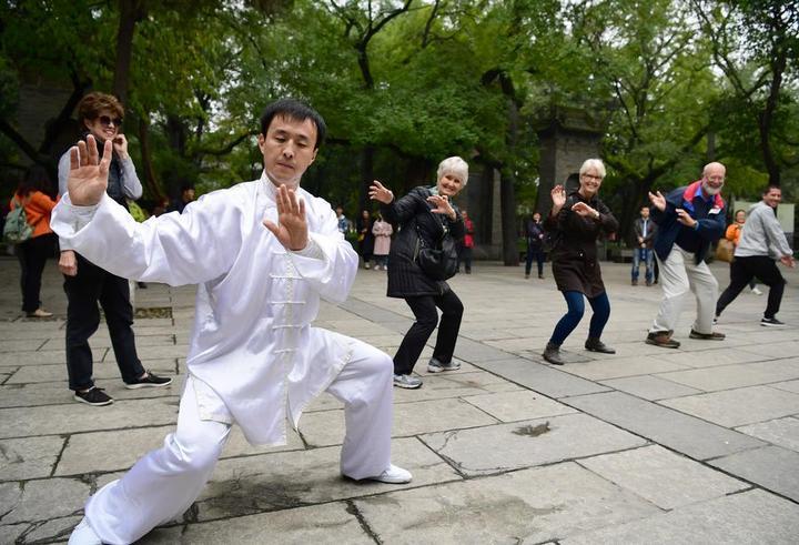 這是西安“80后”小伙趙慶(前)在小雁塔景區內向外國游客教授楊氏太極拳動作。新華社記者邵瑞攝