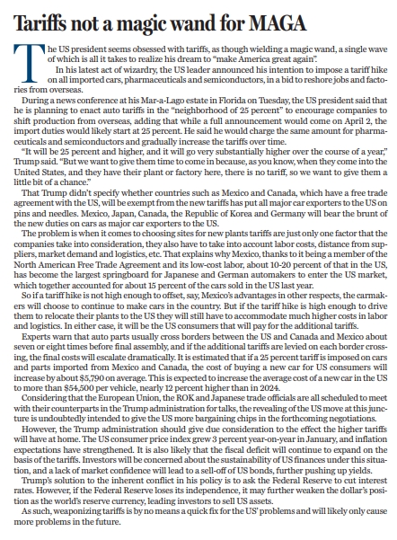 但是,特朗普政府也應(yīng)該充分考慮高額關(guān)稅將給其國內(nèi)帶來的影響。美國1月CPI同比增速升至3%,通脹預(yù)期不斷加強。在加征關(guān)稅的基礎(chǔ)上,美國的財政赤字很可能將持續(xù)擴大。在這種情況下,投資者將對美國財政的可持續(xù)性產(chǎn)生擔(dān)憂,而市場信心缺失會導(dǎo)致美債被拋售,從而進一步推高收益率。