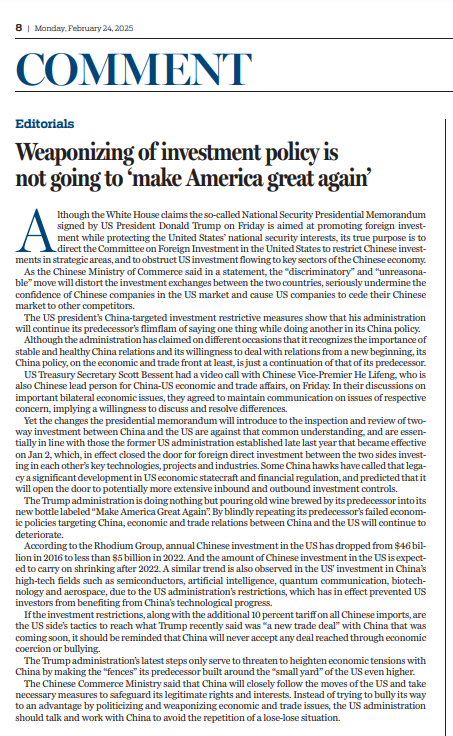 上周五(2月21日),美國總統特朗普簽署所謂的“國家安全總統備忘錄”(下稱“備忘錄”)。白宮稱,該備忘錄旨在鼓勵外來投資的同時,保護美國國家安全利益。然而,其真實目的是責令美國外國投資委員會限制中國對美國關鍵領域投資,并妨礙美國對中國關鍵領域投資。