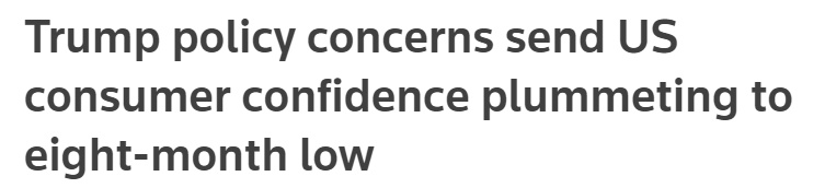 報(bào)道稱,特朗普是因?yàn)橄蛎绹顺兄Z會(huì)降低通脹和物價(jià)才當(dāng)選總統(tǒng)的。在他獲勝后,美國企業(yè)和消費(fèi)者信心曾一度飆升。但他在上任后的僅僅一個(gè)月內(nèi)就宣布了連串加征關(guān)稅計(jì)劃,從而“導(dǎo)致美國消費(fèi)者信心暴跌至八個(gè)月以來的最低點(diǎn)”。