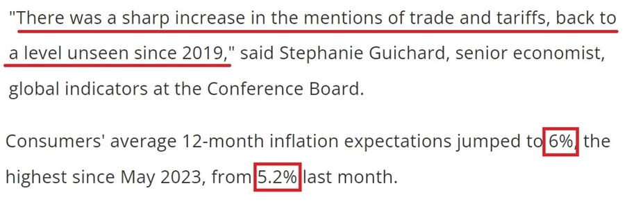 在美國CCI以三年半以來的最大速度惡化的同時(shí),美國消費(fèi)者對(duì)未來一年的通脹預(yù)期也從5.2%大幅升高至6%,達(dá)到2023年5月以來的最高水平。這進(jìn)一步顯示,美國人對(duì)特朗普政府政策可能對(duì)經(jīng)濟(jì)造成的負(fù)面影響越來越擔(dān)憂。
