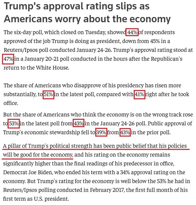根據(jù)路透社與益普索集團(tuán)聯(lián)合進(jìn)行的一項(xiàng)最新民調(diào)結(jié)果,對(duì)特朗普的總統(tǒng)工作表示認(rèn)可的受訪美國人比例已從他剛剛重返白宮后的47%降至44%,而不滿意他工作的受訪者比例則從他剛剛上任時(shí)的41%大幅上升到了51%。