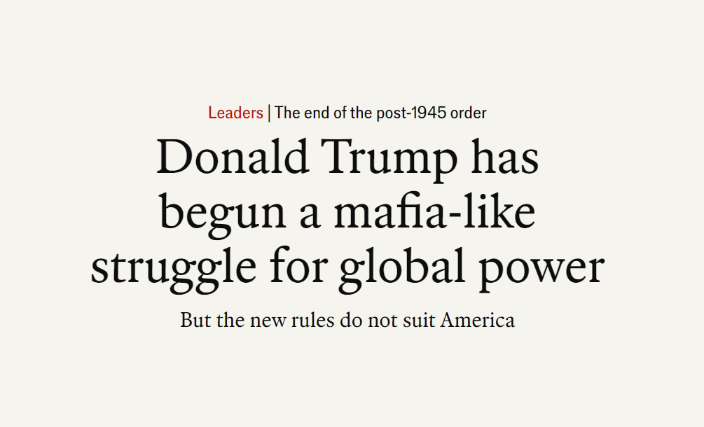 英國《經濟學人》網站近期刊文稱,美國總統特朗普已經開啟一場黑手黨式的全球權力爭奪。1945年后建立的世界秩序正在加速撕裂。一個強權即公理、小國受欺負的世界正快速到來。文章摘要如下:
