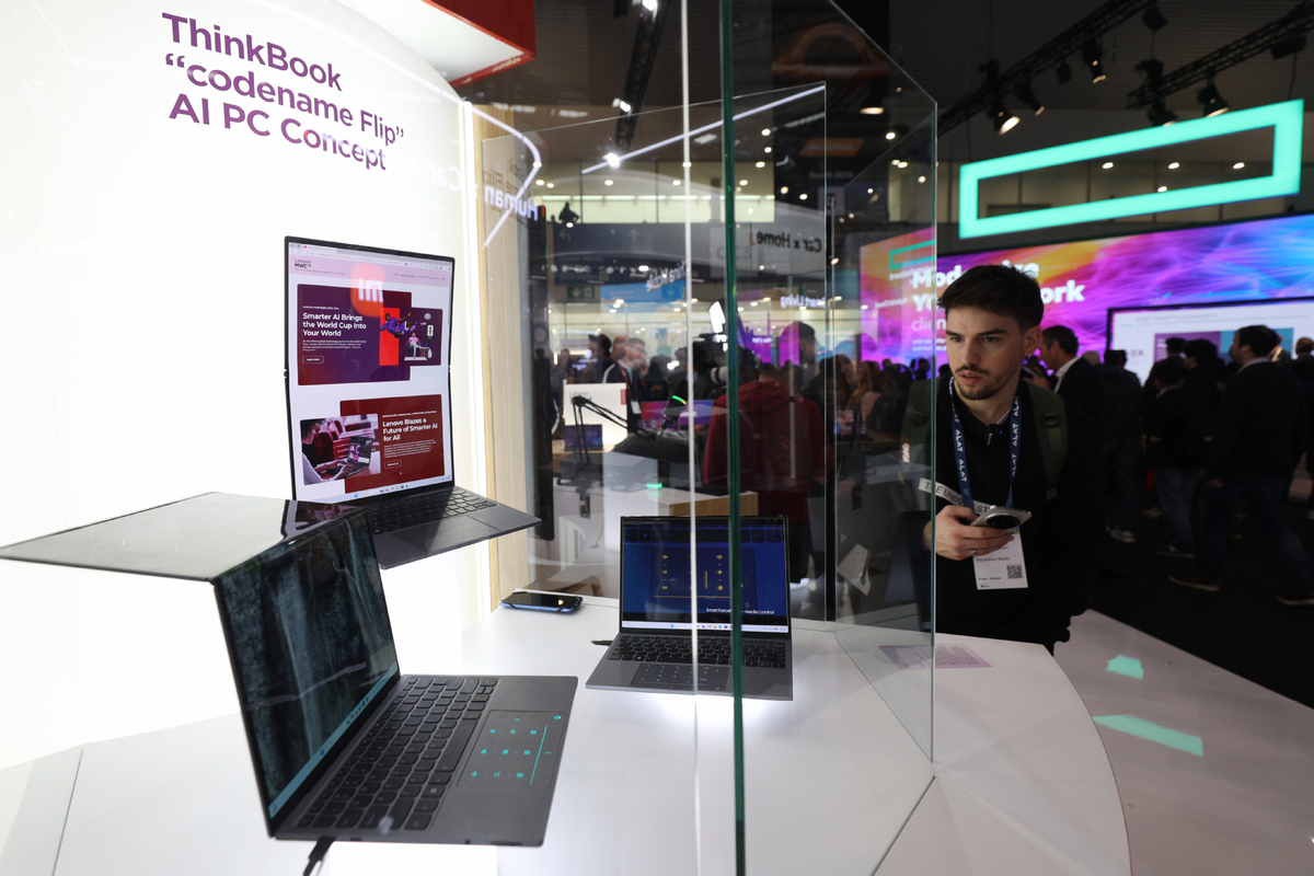 3月3日,在西班牙巴塞羅那舉行的2025年世界移動通信大會上,一名男子在聯想展區參觀外折屏筆記本電腦ThinkBook Flip AI PC概念機。(圖片來源:新華社)