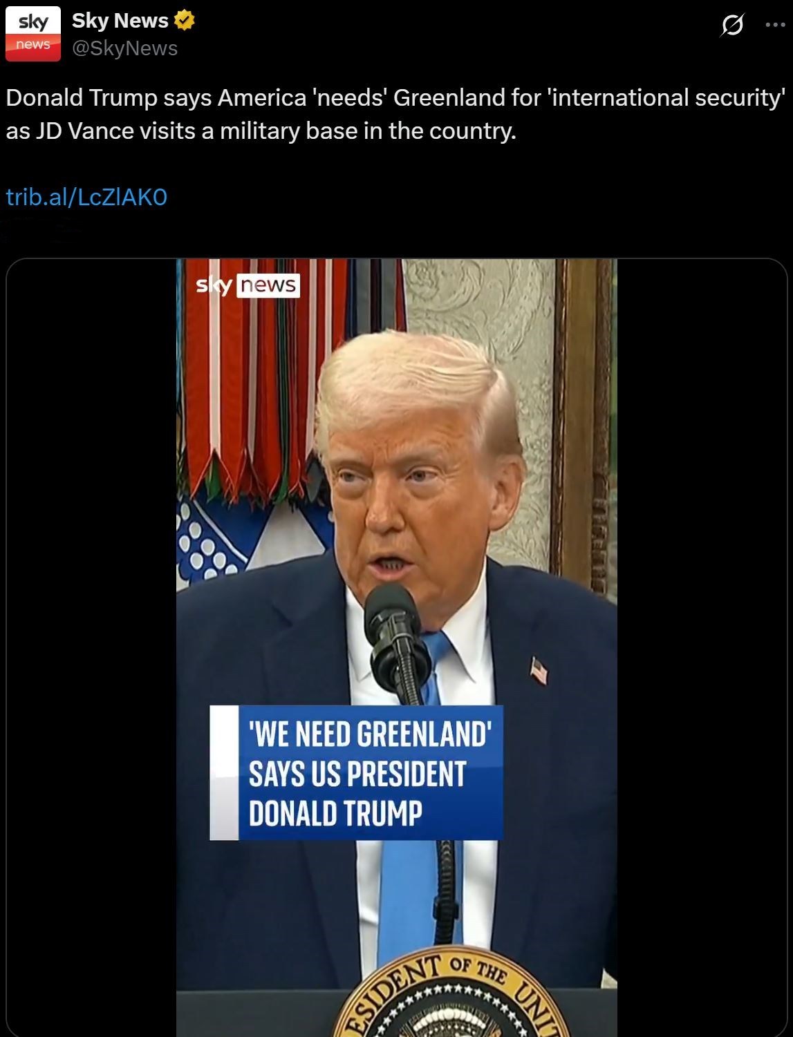 “格陵蘭島對于美國的安全至關重要,而它現在非常脆弱。如果格陵蘭島人民愿與美國合作,而且我也認為他們最終會與美國合作,我們可以讓他們更安全。”