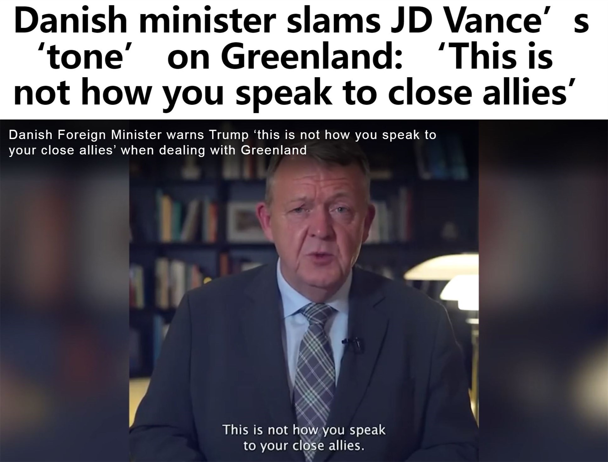 丹麥外交大臣拉斯穆森29日在社交媒體上發表視頻講話,批評萬斯有關格陵蘭島表態的“調調”。