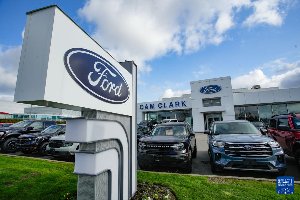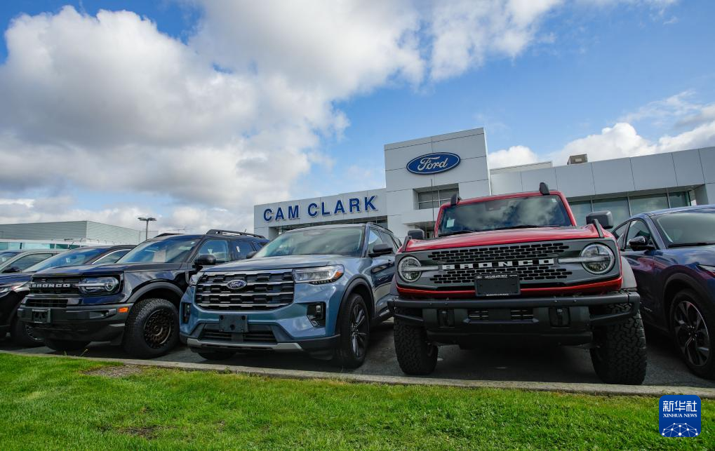 4月3日,車輛陳列在加拿大溫哥華一家福特汽車經銷商店面外。新華社發(梁森攝)