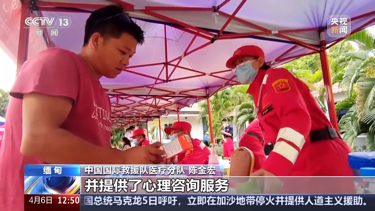 中國國際救援隊醫療分隊 陳金宏:今天我們來到這里,開展內外婦兒診療,進行防疫消殺的培訓,并提供了心理咨詢服務,下一步結合曼德勒市傷情災情,我們會持續為當地災民做好醫療服務。