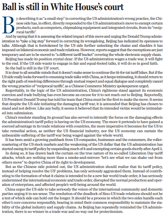 理智之人不難看出,繼續針鋒相對地加征關稅已然毫無實際意義。如果美方真如其所暗示的那樣,期待與中國重啟談判,就應像中國商務部新聞發言人所敦促的那樣,徹底取消“對等關稅”的錯誤做法,回到相互尊重,通過平等對話解決分歧的正確道路上來。