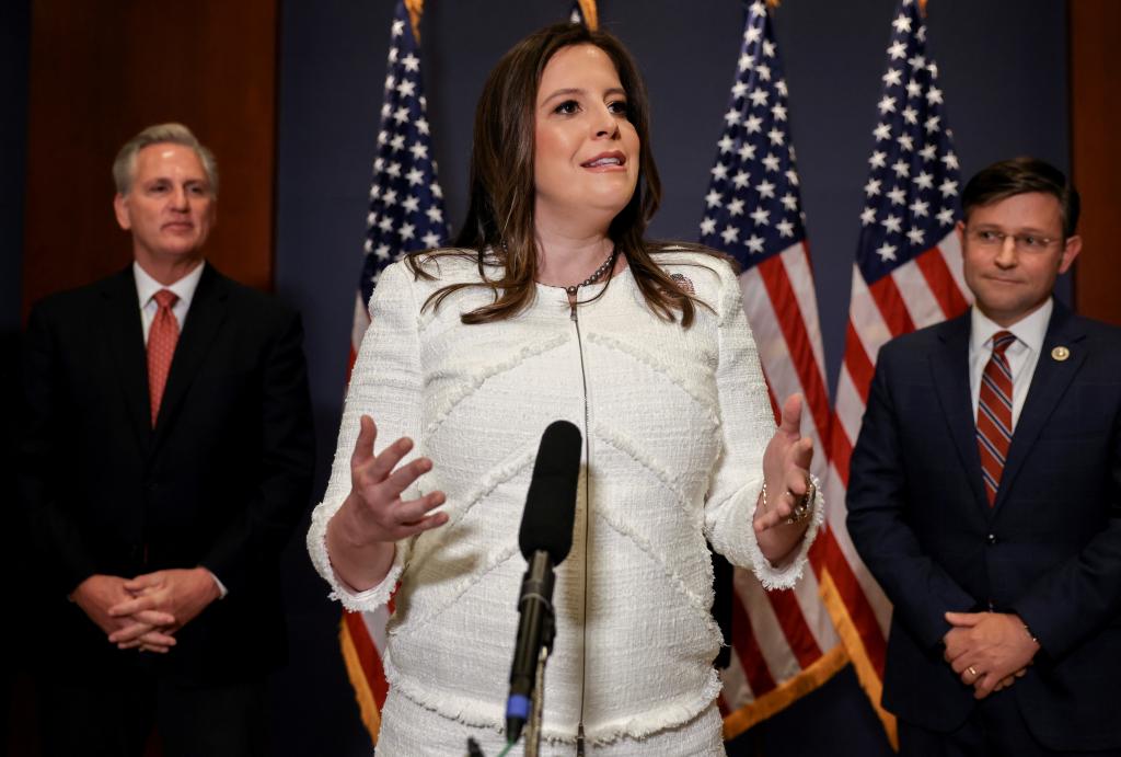 2021年5月14日,美國紐約州共和黨籍聯邦眾議員愛麗絲·斯蒂芬尼克在華盛頓國會山向記者講話。新華社/路透
