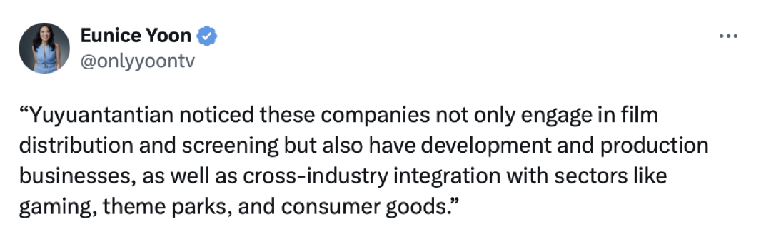 除此之外,譚主此前也就國(guó)家電影局的相關(guān)表態(tài)做過(guò)解讀。當(dāng)時(shí)就說(shuō)了一個(gè)觀點(diǎn),如果中國(guó)消費(fèi)者開始在電影領(lǐng)域減少選擇美國(guó)產(chǎn)品,這種趨勢(shì)很可能會(huì)外溢到其他領(lǐng)域,很多國(guó)際媒體做了轉(zhuǎn)引。