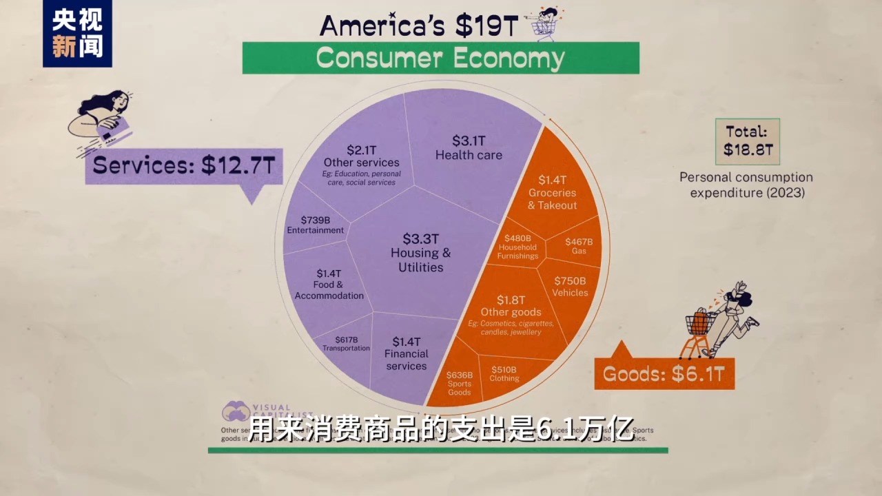按美國勞動局數據,美國人2023年消費支出18.8萬億美元,其中12.7萬億花在了看病、租房、交學費、打官司等服務上,用來消費商品的支出是6.1萬億,不到總消費的三分之一。所以吹噓美國消費能力強屬實是個“地獄笑話”,看病花錢多有什么可驕傲的?