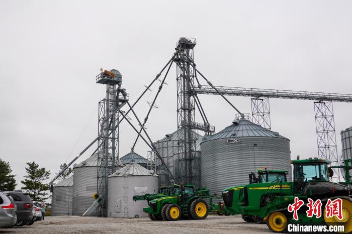 當地時間4月25日,在美國艾奧瓦州首府得梅因市郊的金伯利農場,多輛拖拉機停在谷倉附近。 中新社記者 王帆 攝