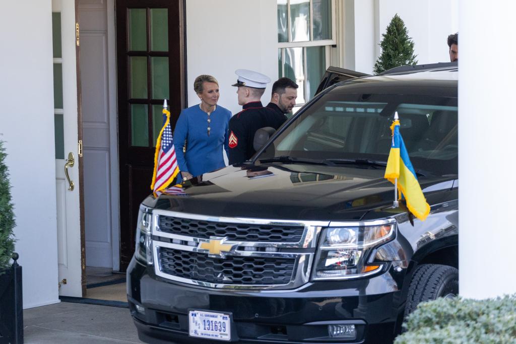 2月28日,烏克蘭總統澤連斯基(左三)離開美國華盛頓白宮。新華社記者胡友松攝