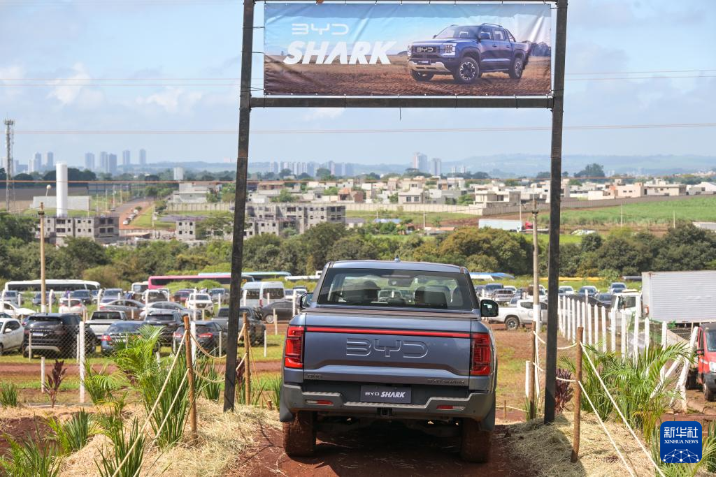 4月29日,在巴西圣保羅州里貝朗普雷圖市舉行的2025年巴西農業科技展上,一輛比亞迪皮卡進行越野演示。新華社記者 陳昊佺 攝