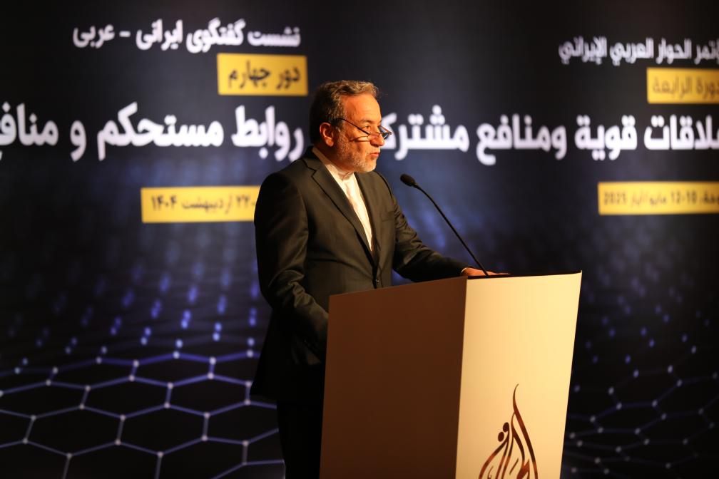 5月10日,伊朗外長阿拉格齊在卡塔爾多哈出席第四屆阿拉伯-伊朗對話會議時講話。新華社發(主辦方供圖)