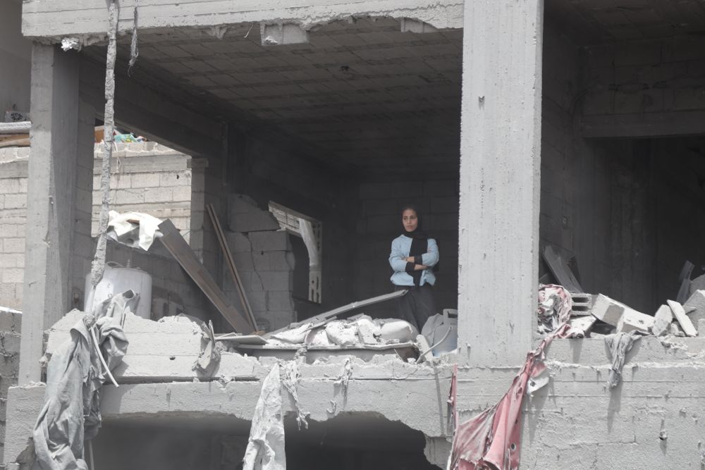 5月17日,在加沙地帶北部杰巴利耶難民營,一名女子站在破損的房屋中。新華社發(阿卜杜勒拉赫曼·薩拉馬 攝)