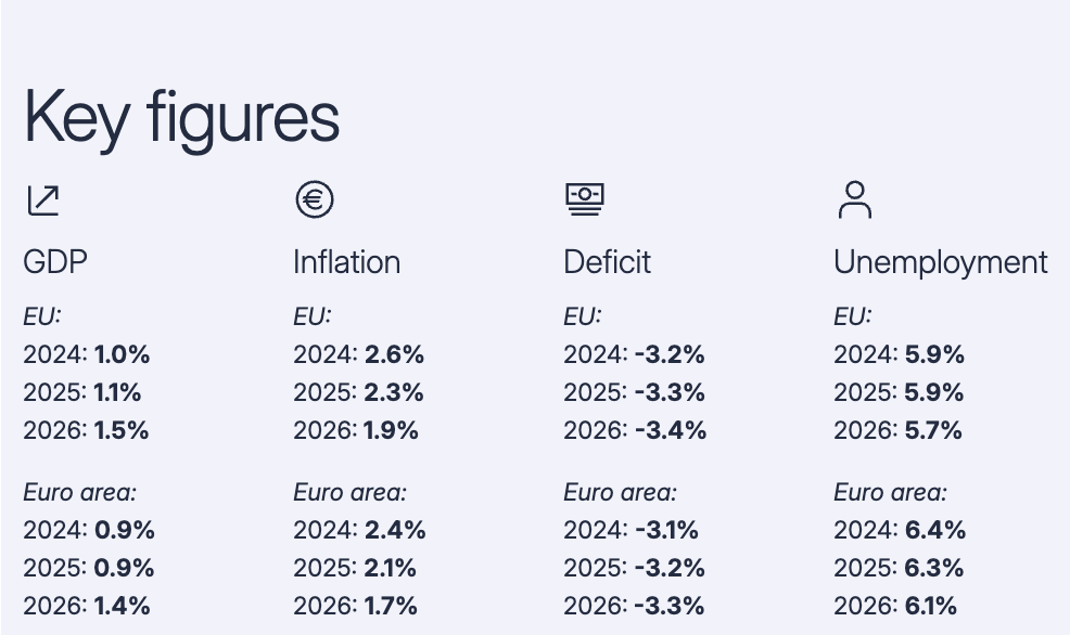 報告預測,今年歐元區經濟僅增長0.9%,歐盟經濟僅增長1.1%。與去年11月份發布的秋季經濟展望相比,經濟增長預期大幅下調。而去年則預測今年歐元區經濟增長1.3%,歐盟經濟增長1.5%。