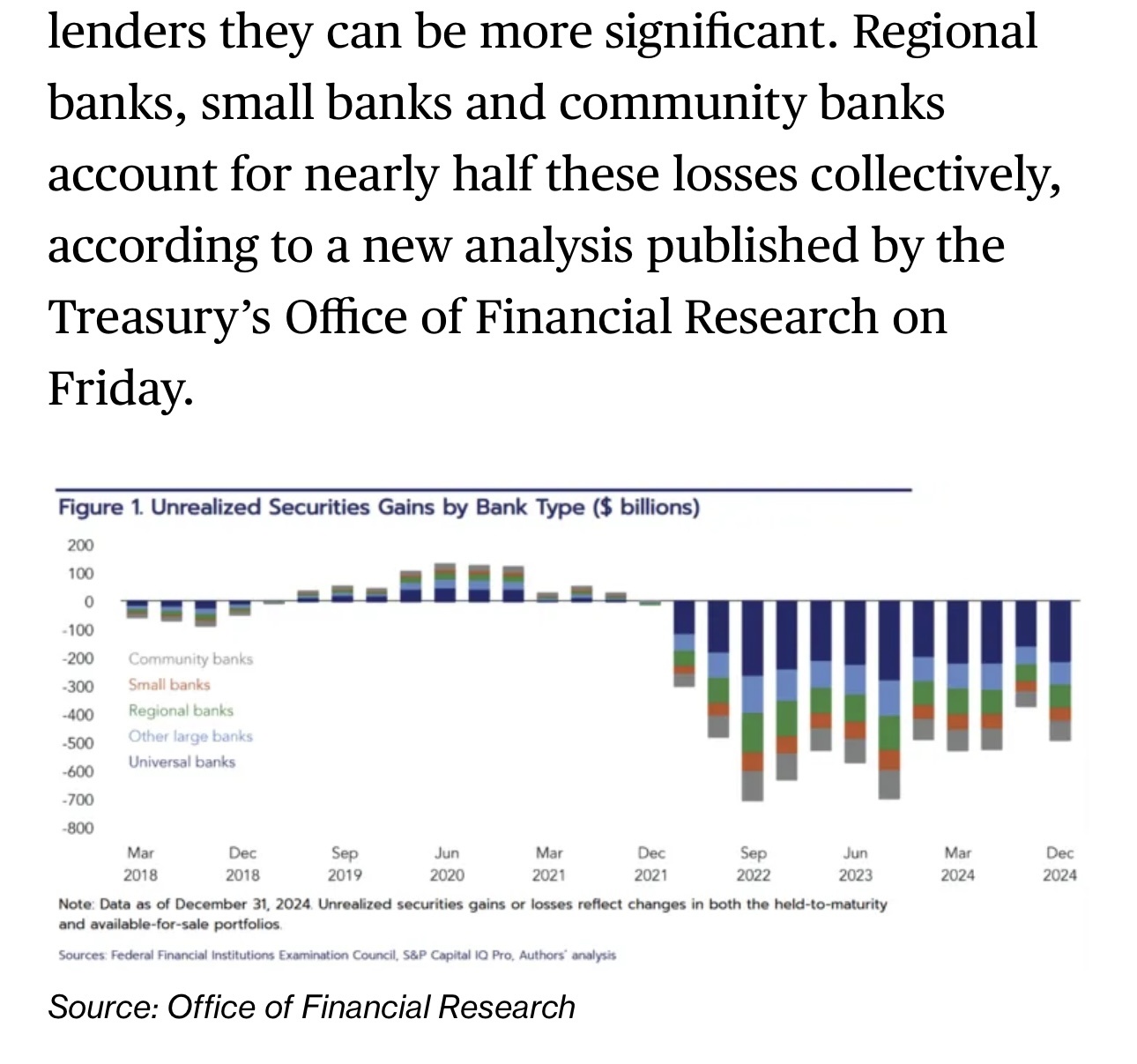 文章回憶道,2022年和2023年,美國國債和抵押貸款債券的“未實現(xiàn)損失”成為貸款機構(gòu)的一大擔(dān)憂,當(dāng)時利率大幅上升,引發(fā)了以硅谷銀行為首的幾家銀行倒閉。“未實現(xiàn)損失”,是指在某個資產(chǎn)或證券的市場價值低于其購入價格的情況下,尚未出售或平倉的投資組合中的損失。