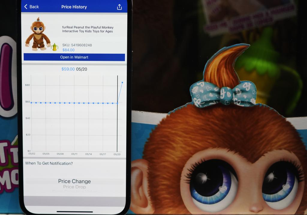 5月21日,在美國舊金山灣區圣利安卓San Leandro的一家沃爾瑪超市,價格跟蹤軟件(Walmart Tracker)顯示商品(中國產毛猴玩具)售價變化。新華社記者吳曉凌攝