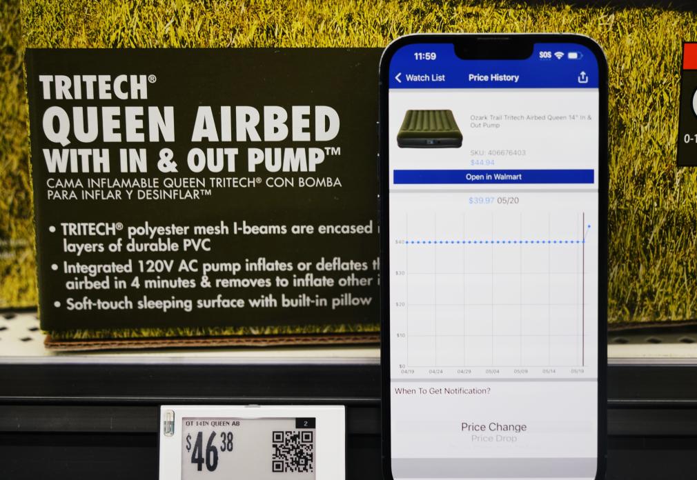 5月21日,在美國加利福尼亞州舊金山灣區圣萊安德羅的一家沃爾瑪超市,價格跟蹤軟件顯示一款中國產充氣床墊售價變化情況。新華社記者 吳曉凌 攝