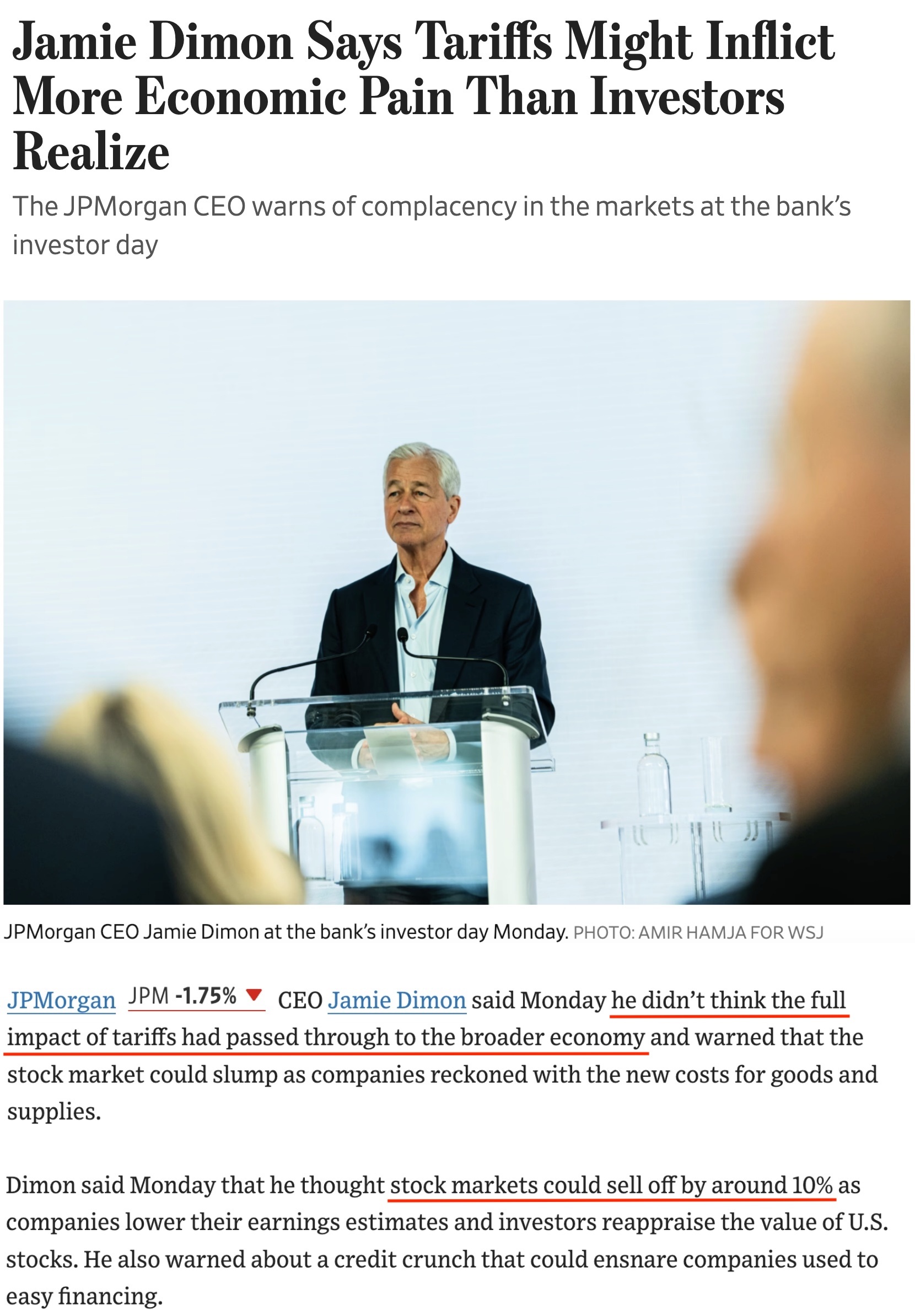 摩根大通公司首席執行官杰米·戴蒙近日指出,關稅的全部影響尚未傳導至整體經濟,通脹加劇和滯脹的可能性比人們認為的要大,隨著企業下調利潤預期以及投資者重新評估美國股票的價值,股市可能下跌約10%。