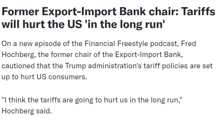 美國進出口銀行前行長弗雷德·霍奇伯格也曾警告稱,美國政府的關稅政策將對美國經濟和消費者造成長期傷害。